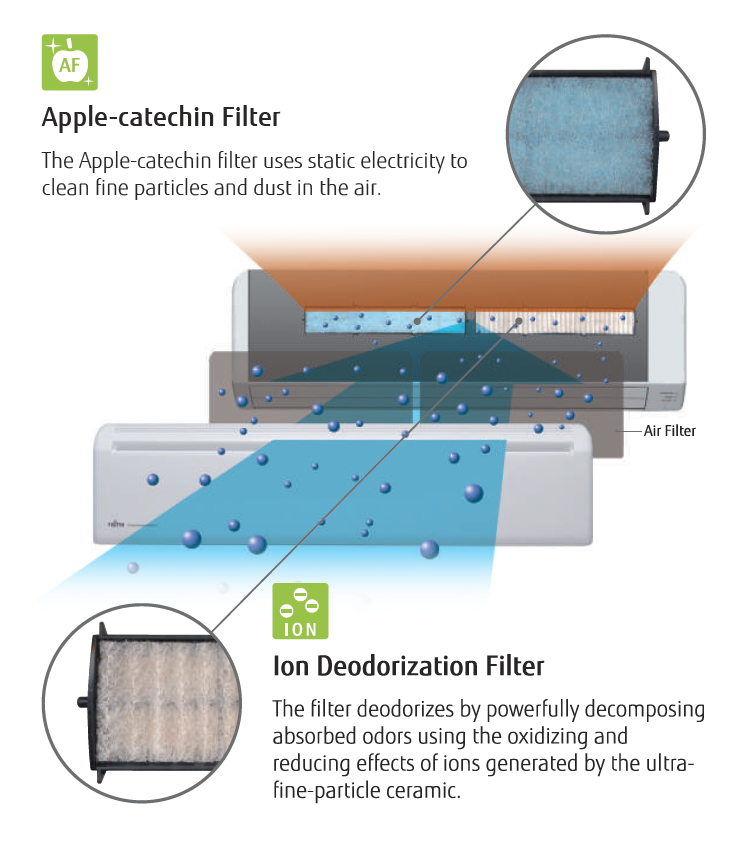 The Apple-catechin filter uses static electricity to clean fine particles and dust in the air.