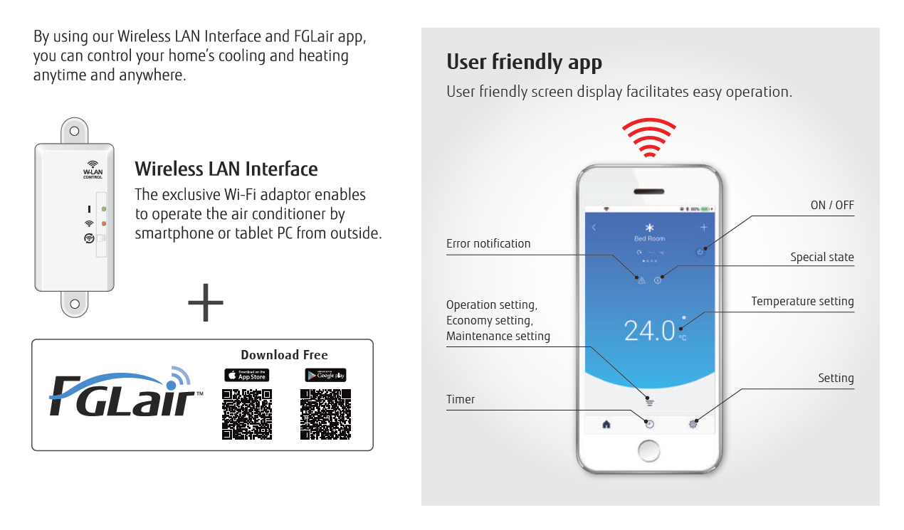 By using our Wireless LAN interface and Fujitsu app, you can now control your home's cooling anytime and anywhere.