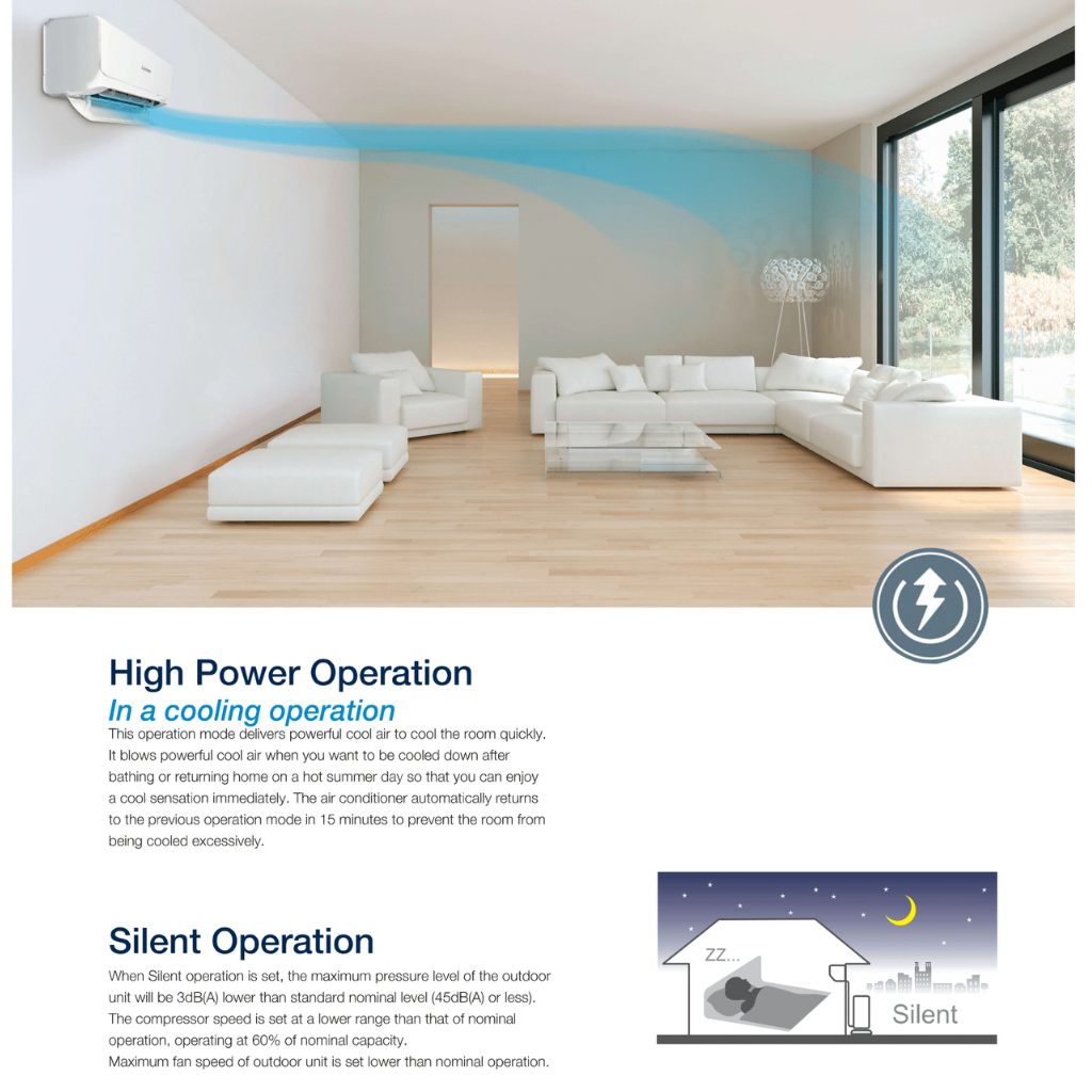 • Outdoor fan speed is automatically lowered during Silent Mode for ultra-quiet performance.